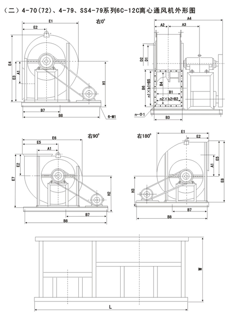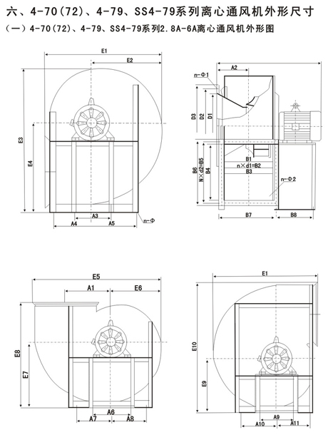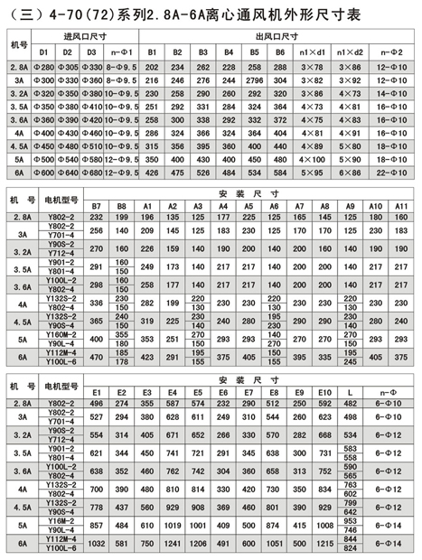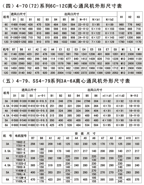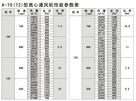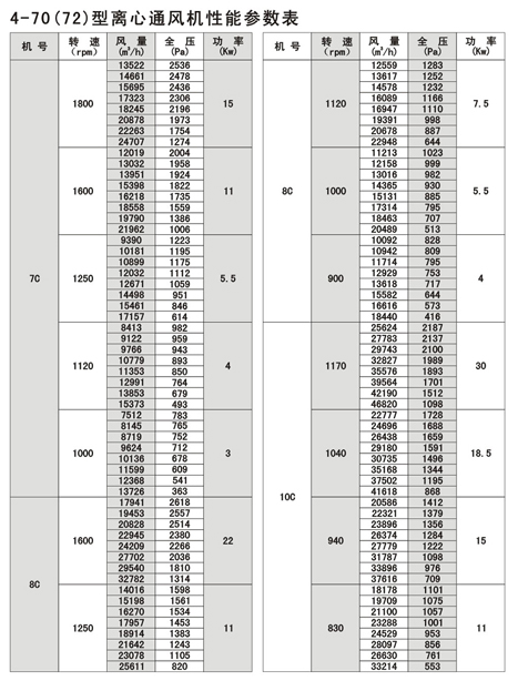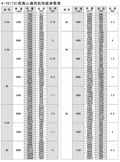 4-72型不銹鋼離心風(fēng)機(jī)風(fēng)量:930~154000m3/h,風(fēng)壓170~2950Pa;4-79型通風(fēng)機(jī)共20種機(jī)號(hào),風(fēng)量1100~438000 m3/h,風(fēng)壓230~3320Pa,用戶可根據(jù)不同參數(shù)選擇。